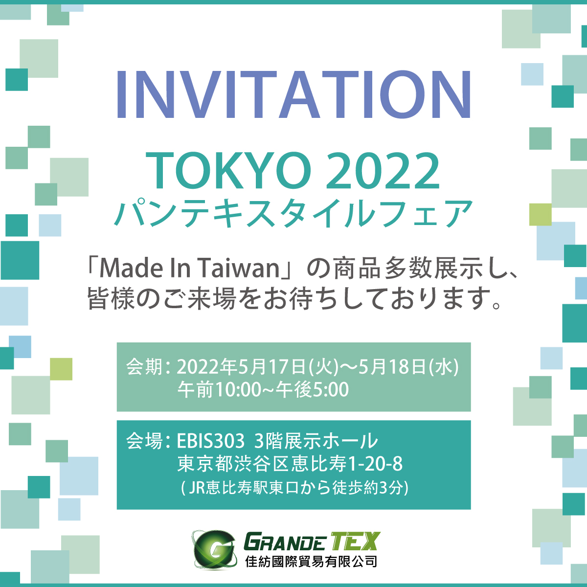 2022 PAN TEXTILES TOKYO パンテキスタイルフェア 2022年5月17日(火)~5月18日(水) 午前10:00~午後5:00 21社の厳選された台湾テキスタイルメーカーが 最新のハイファッション・ハイテクテキスタイルを展示します。 Read More