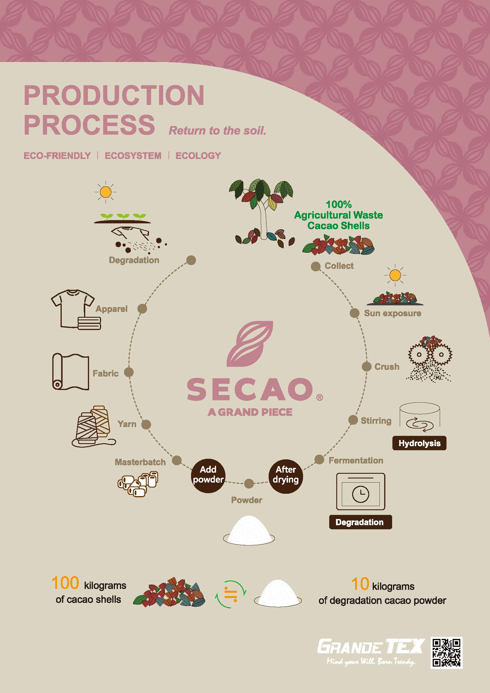 Grandetex transforms this agricultural waste into high-performance, sustainable yarn using our unique fermentation & hydrolysis technology. Natural extracts are blended into polymer masterbatches and spun into SECAO® bio-based yarn, combining eco-conscious innovation with textile functionality.